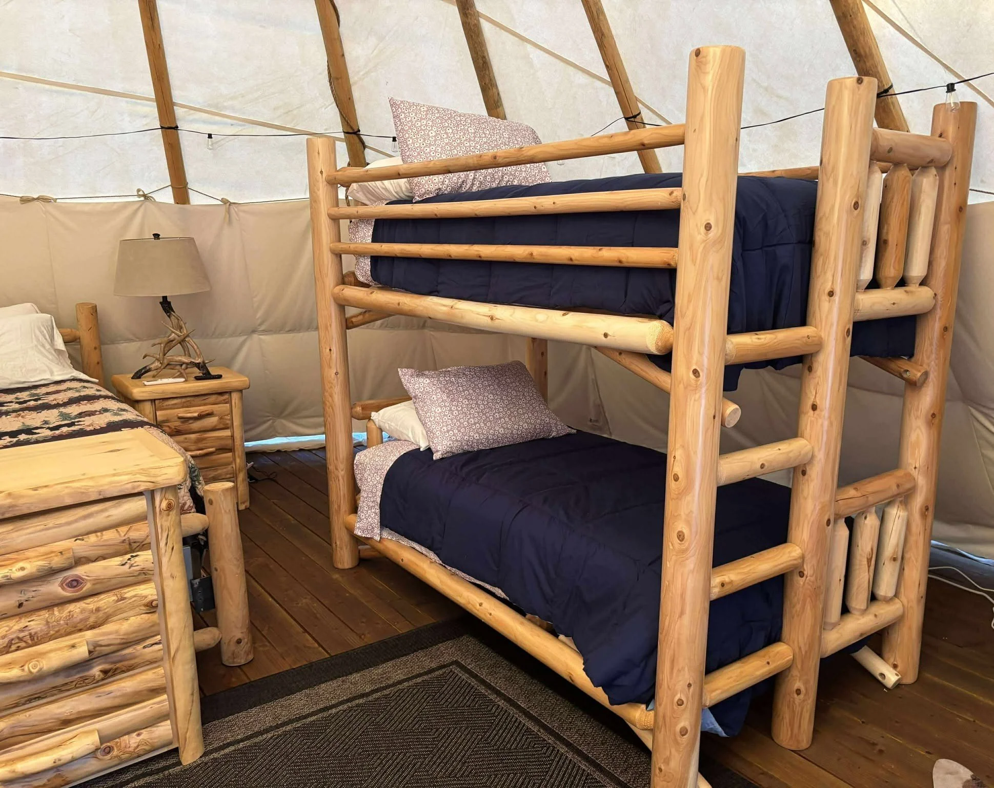 Elegant Tipis: Sleep under the stars in our spacious, fully furnished tipis, which feature cozy beds and rustic charm. They have air conditioning, heat, a mini fridge, and a Keurig coffee maker.